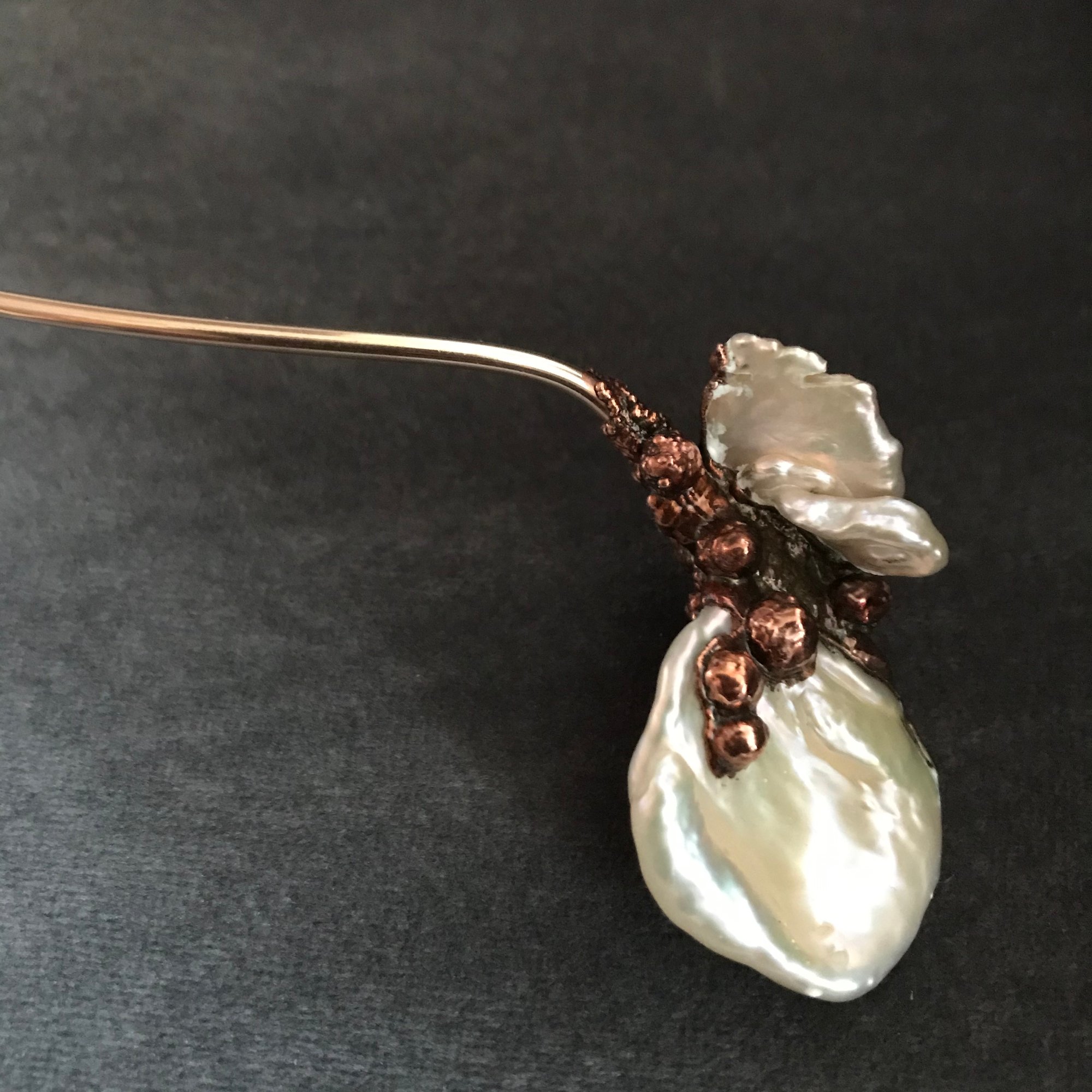 slimline gold-filled wire asymmetrically set with a cluster of luminous pearls set in authentic beach sand is encapsulated inside a shell of copper