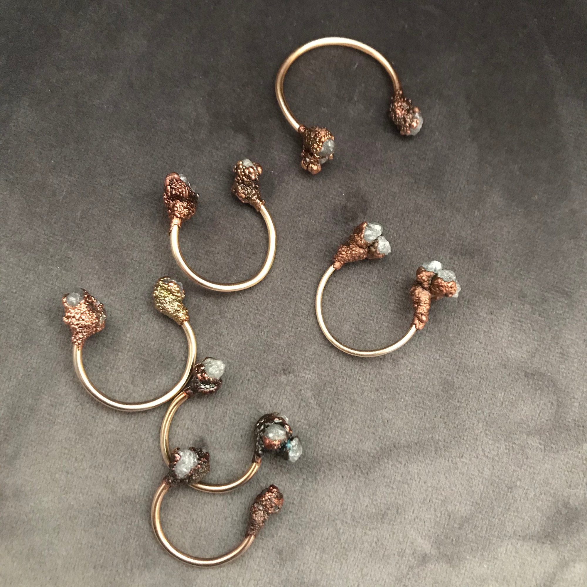 14k gold filled band with raw grey diamonds set in beach sand and then encapsulated in copper